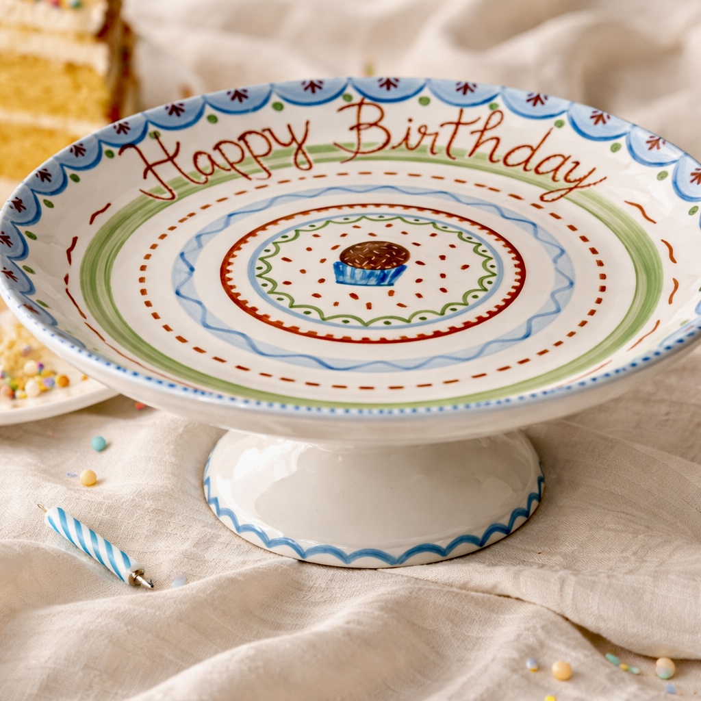 A Boleira Happy Birthday de Porcelana pintada a mão da ainda mais cor e vida além de trazer exclusividade a mesa em datas comemorativas.