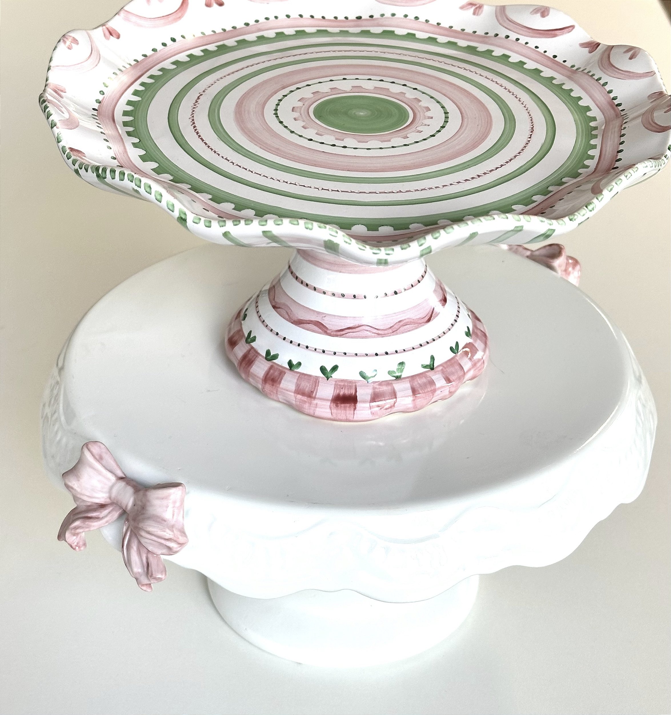 Boleira Ondas Com detahes em tons candy colors, suave e que compõe a mesa com delicadeza. Lindo, uma peça que encanta e deixa cada momento único e mais especial. E Boleira Reta com Laço de Porcelana • tornando uma dupla lindíssima para compor mesa de bolo e doces.
