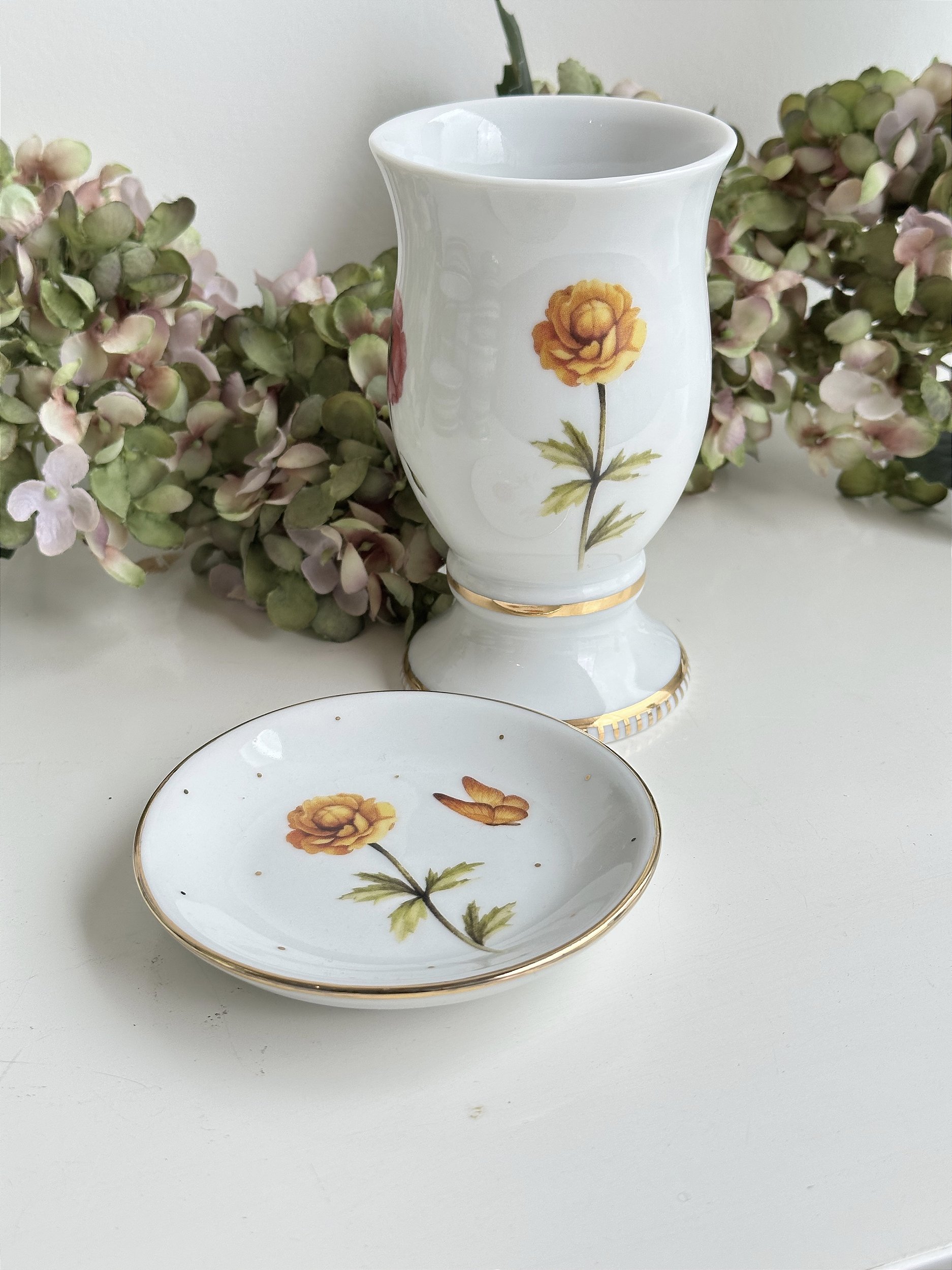 O jogo de vaso e pratinho porta joias em porcelana combina beleza e funcionalidade para decorar e organizar.